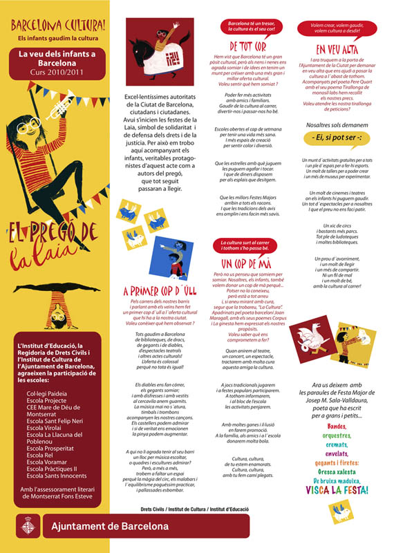 • Fem el Pregó de la Laia. Durant els mesos de desembre i gener, es fa conjuntament el Pregó de la Laia del 2011. Cada centre rep l’encàrrec d’elaborar en forma de rodolí una de les seves propostes. D’aquesta manera, el pregó esdevé una obra de creació col·lectiva i representativa de la veu dels infants de Barcelona.