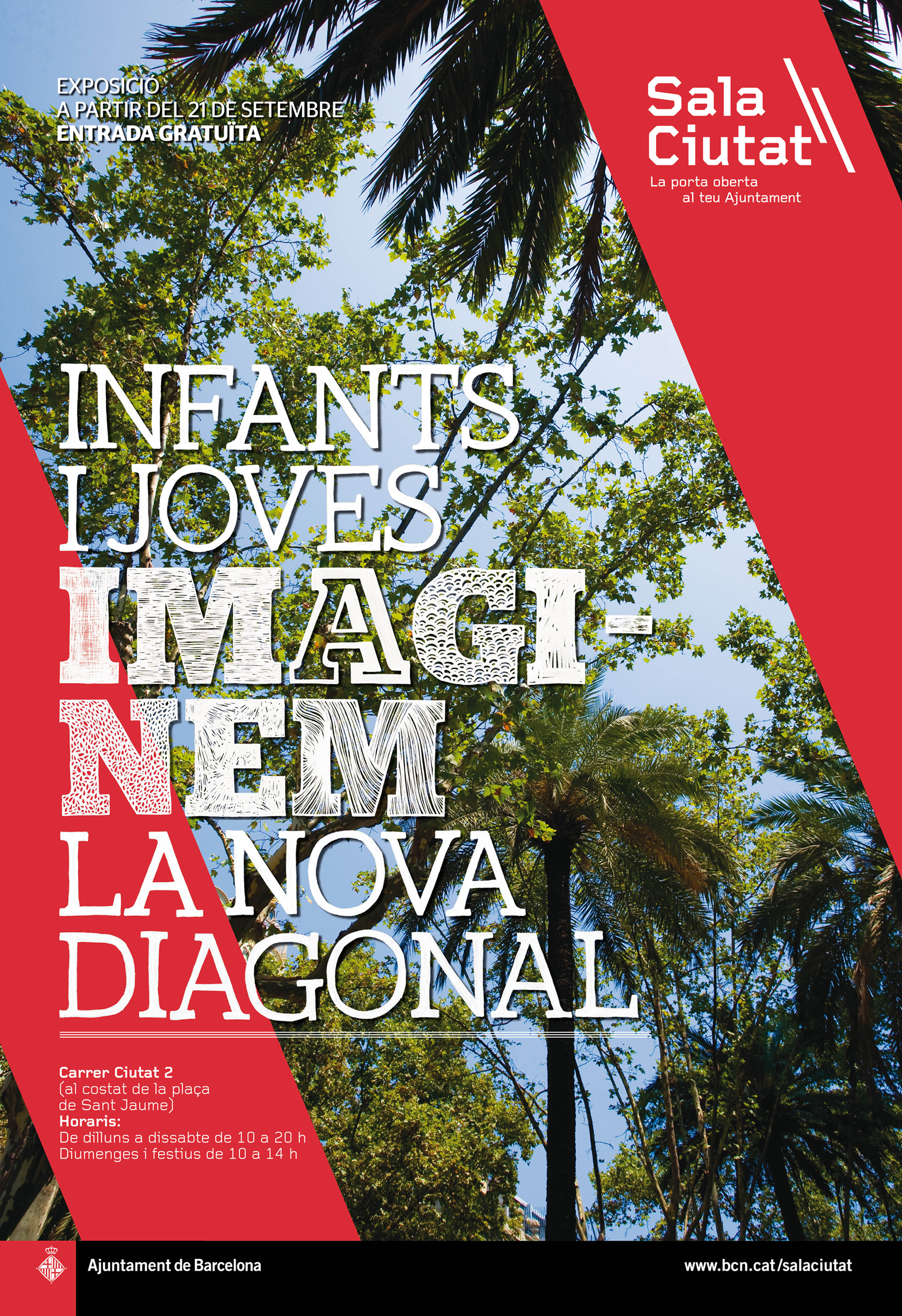 L’exposició "Infants i joves imaginem la nova Diagonal" present a Sala Ciutat des del passat dia 21 de setembre és el resultat de les idees i aportacions sobre la nova Diagonal que van fet els infants i joves de 8 a 16 anys de 23 escoles de Barcelona a través dels tallers de participació. Els infants i joves, com a ciutadans de present i de futur de Barcelona, van exposar a través d’uns murals les seves propostes i aportacions en el projecte per la transformació de la nova Diagonal. Aquestes propostes, han estat recollides en un informe tècnic i arribaran a mans dels arquitectes que dissenyaran la nova Diagonal. Amb aquests tallers s’ha volgut donar veu a un col·lectiu molt important de Barcelona, els infants i joves, que gaudeixen i gaudiran de la nova Diagonal del futur.
