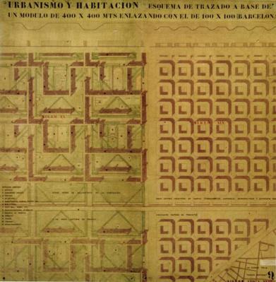 Esquema de traçat a base d'un mòdul de 400x400m enllaçat amb el de 100x100m. Urbanisme i Habitació, Pla Macià, 1934. (Reproducció, Arxiu Històric del COAC-Demarcació de Barcelona).