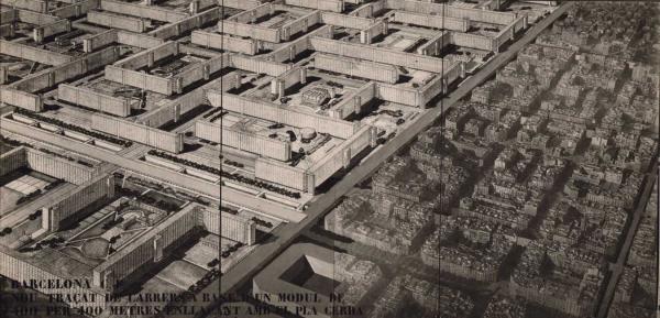 Nou traçat de carrers a base d'un mòdul de 400x400m enllaçant amb el Pla Cerdà. Barcelona C.F., Pla Macià 1934. (Reproducció, Arxiu Històric del COAC Demarcació de Barcelona).