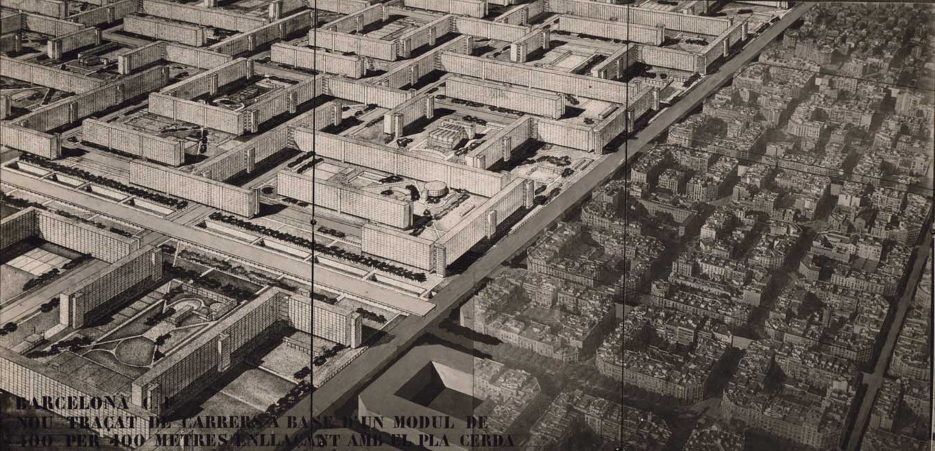 Nou traçat de carrers a base d'un mòdul de 400x400m que enllaça amb el Pla Cerdà, Pla Macià, 1934.